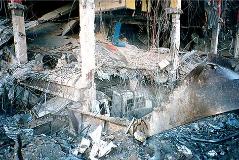 This is what the south tower looked like after its collapse. A 60ft trench was left in Liberty Street. |
